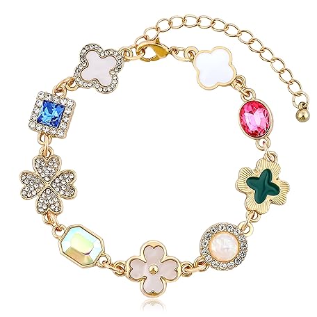 MOONWALTZ Gold Clover Charm Link Bracelet for Women Elegant Mother of Pearl Lucky Four Leaf Clover Bracelet Cute Colorful Rhinestone Clover Pendant Bracelet Adjustable Link Chain Trendy Party Jewelry Gift