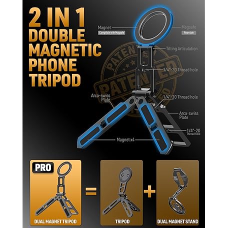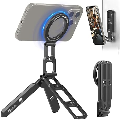 MOSENVKA Dual Magnetic Phone Tripod Foldable Double Magnet Mount Pocket Cell Phone Stand for iPhone 16/15/14/13/12 Plus Max for Ipad Travel Gym Magnetic Tripod [US Patent Registered]