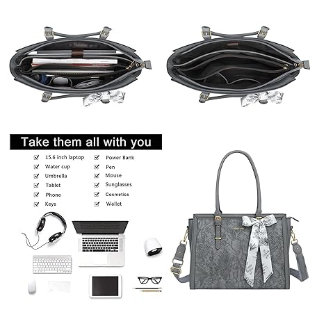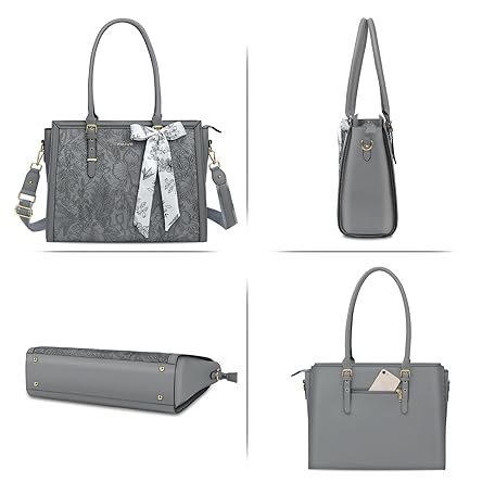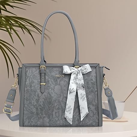 Thông tin sản phẩm MOSISO Laptop Bag for Women, PU Leather Tote Bag, Front Embossed Retro Hibiscus Computer Bags with Silk Scarf&Clutch Purse