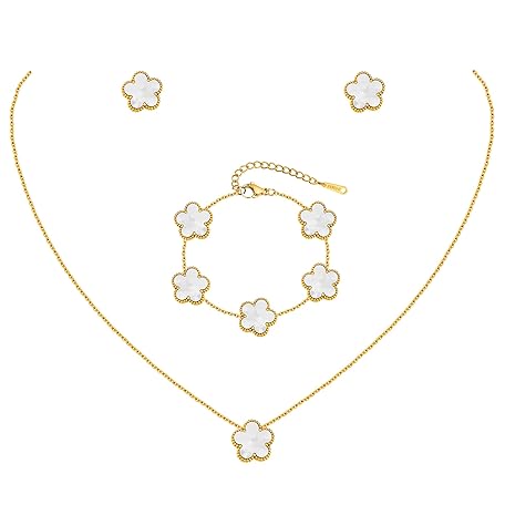 MPRAINBOW Gold Necklaces Bracelets Earring Set - 18K Gold Plated Flower Bracelet Chain,Stainless Steel Non Tarnish Floral Pendant Stud Jewelry Sets,Christmas Birthday Lucky Gift for Mom Wife Daughter Girlfriend
