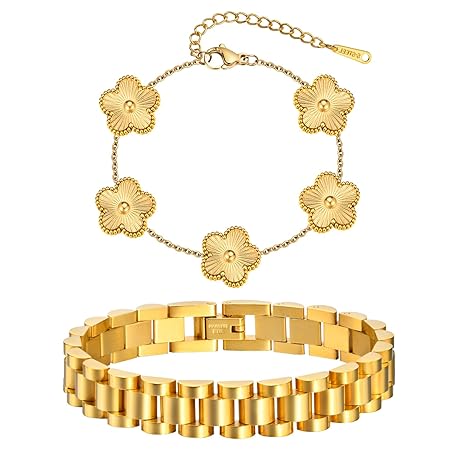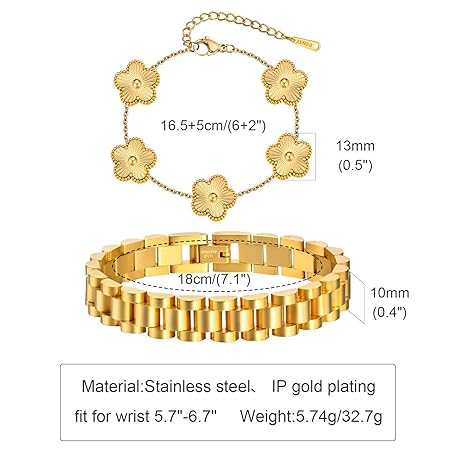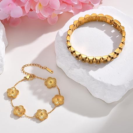 MPRAINBOW Stackable Gold Floral Bracelets Set , 2pcs 18K Gold Plated Bracelet Non-tarnish,Stainless Steel Link Chain Friendship Bracelet,Watch Band Trendy Jewelry,Christmas Valentines Birthday Gifts for Women