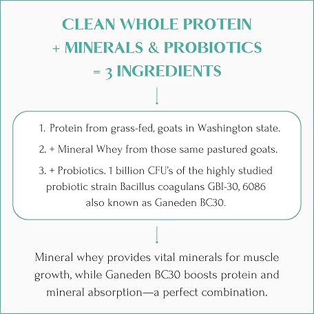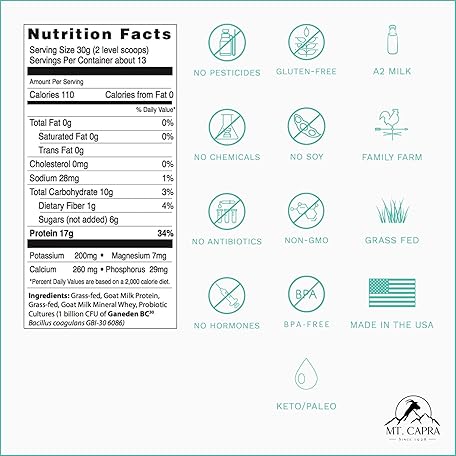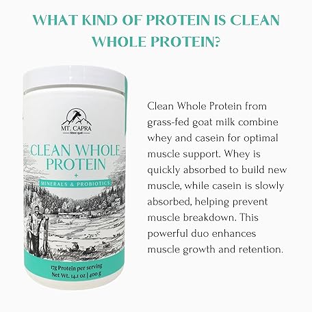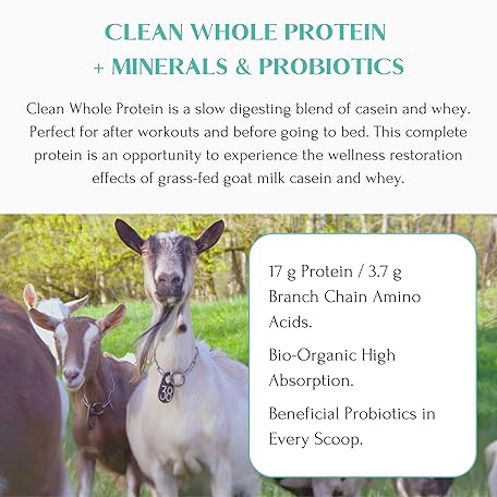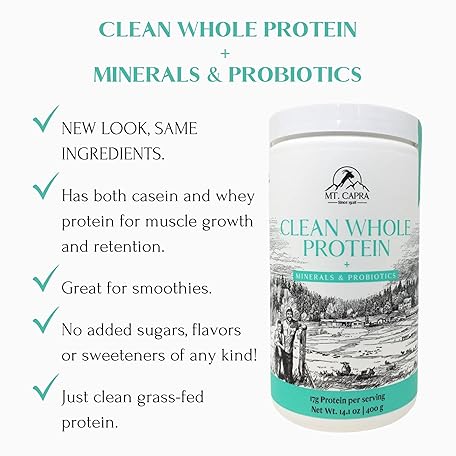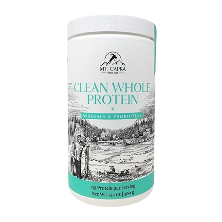 Thông tin sản phẩm Mt. Capra Clean Whole Protein + Minerals & Probiotics | Grass-Fed Goat Milk Protein, Contains Casein and Whey Protein, No Sweeteners, No Flavors | 17 g Protein per Serving | 13 Servings - 14.1 oz