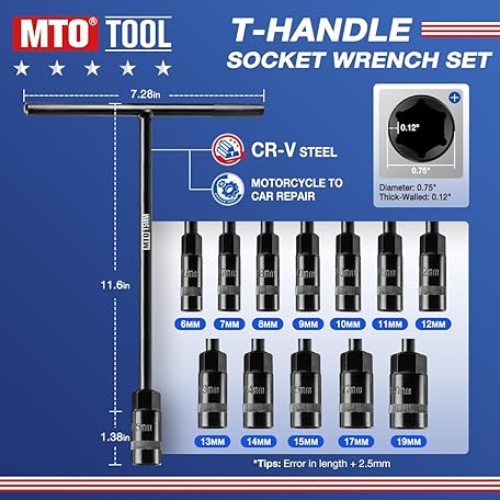 • MTO T-Handle Metric Socket Wrench Set, 6-Point (6mm-15mm, 17mm, 19mm) with Hanging Organizer Strap, Cr-V Steel Lug Wrench Hex Socket for Motorcycle Car Bicycle Repair (12 Pack)