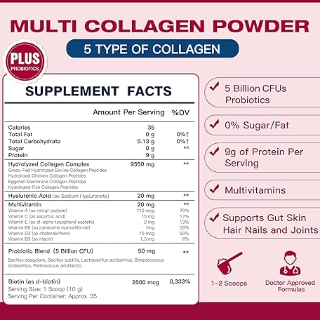 Multi Collagen Peptides Powder with Probiotics - Type I II III V X - Hydrolyzed Collagen Peptides with Multivitamins, Hyaluronic Acid & Biotin - Support Skin Hair Nail Joints & Gut, 35 Servings