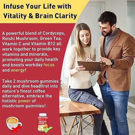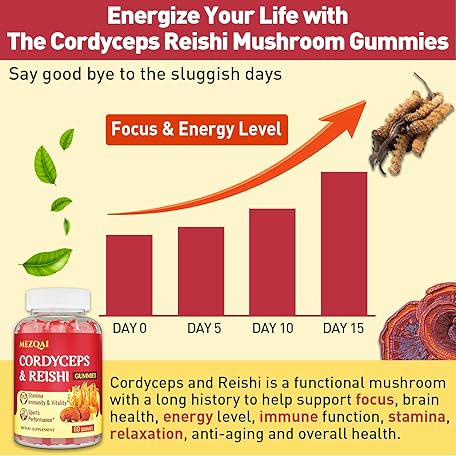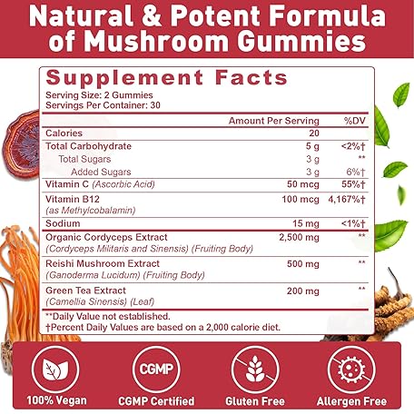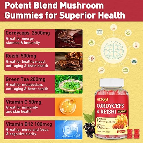 Thông tin sản phẩm Mushroom Gummies, Cordyceps Reishi Mushroom Supplement Gummies for Adults with Green Tea Extract, Brain Supplements for Memory and Focus, Energy, Athletic Performance*, Rest - 60 Count