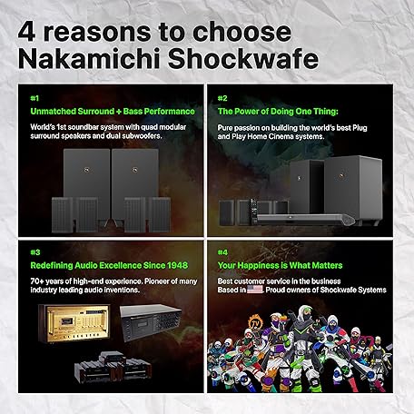 Thông tin sản phẩm Nakamichi Shockwafe Ultra 9.2.4 Channel Dolby Atmos/DTS:X Soundbar with Dual 10" Subwoofers, 4 Rear Surround Effects Speakers, eARC and SSE Max Technology (Flagship)