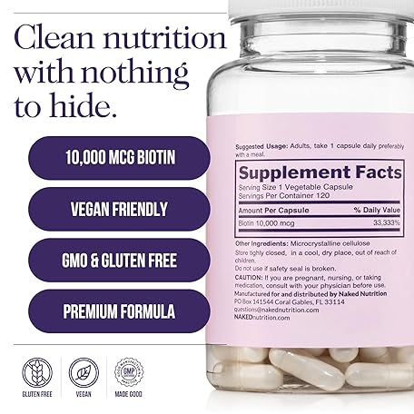 Thông tin sản phẩm NAKED Biotin 10,000mcg - Max Strength Vitamin B7 Supplement for Healthy Hair, Skin & Nails Support - Non-GMO, Gluten-Free, Vegan - Supports Keratin Production - 120 Capsules