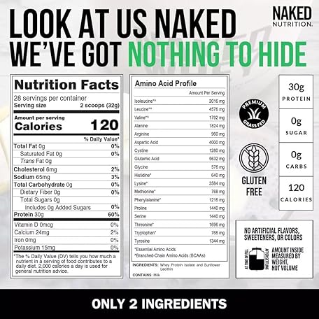 Thông tin sản phẩm NAKED Whey Isolate Protein - Only 2 Ingredients, 30g Grass-Fed Protein, Zero Carb, Unflavored, Undenatured, Non-GMO, No Soy, Gluten-Free, No Preservatives - 28 Servings