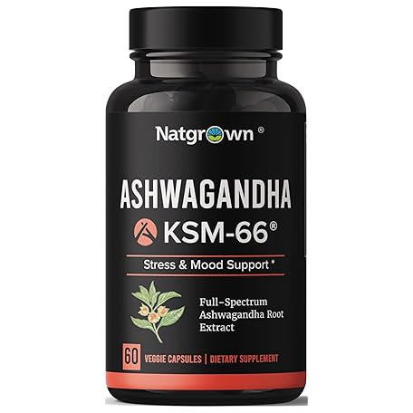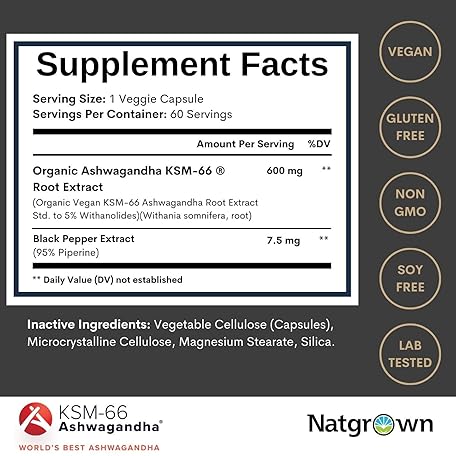 Natgrown Ashwagandha KSM 66 Supplement 600 mg - Stress, Mood, & Athletic Support - Organic KSM66 Root Extract with 5% Withanolides - Vegan Capsules - 60 Count