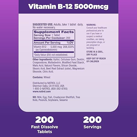 Thông tin sản phẩm Natrol B12 Vitamins 5000 mcg, Fast Dissolve Vitamin B12 Supplement Supports a Healthy Nervous System and Energy Metabolism, 200 Tablets, Up to a 200 Day Supply