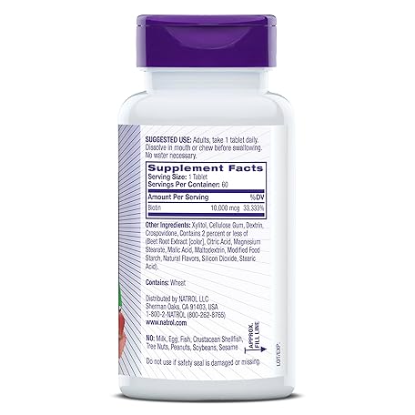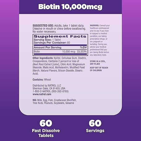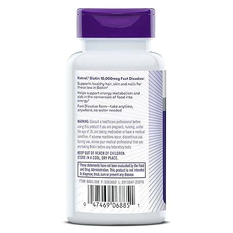 Thông tin sản phẩm Natrol Biotin 10000mcg, 4X Faster Dissolve Supplement for Healthy Hair, Skin and Nails for Those Low in Biotin, Plus Energy Metabolism Support, 60 Tablets, Up to a 60 Day Supply