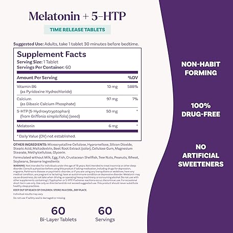 Thông tin sản phẩm Natrol Melatonin + 5-HTP Advanced Time Release Sleep Aid, Triple Action Formula, Calm The Mind, Fall Asleep Faster and Stay Asleep Longer, 60 Bi-Layer Tablets, Up to a 60 Day Supply