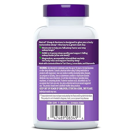 Thông tin sản phẩm Natrol Sleep & Restore Capsules - Calm Magnesium Glycinate, Magnesium Sleep Aid with GABA, Melatonin 5mg, Botanical Blend, 30 Day Supply