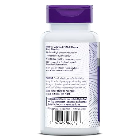 Thông tin sản phẩm Natrol Vitamin B12 5,000 mcg, Fast Dissolve Vitamin B12 Supplement Supports a Healthy Nervous System and Energy Metabolism, 100 Tablets, Up to a 100 Day Supply