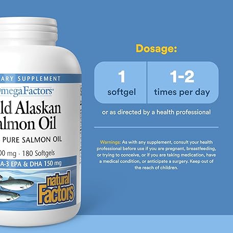 Thông tin sản phẩm Natural Factors Wild Alaskan Salmon Oil Provides Omega-3, EPA, DHA & Vitamin D, Supports Brain & Heart Health, 180 Softgels