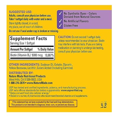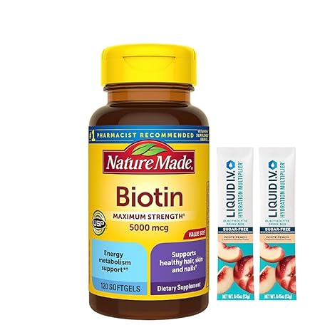 Nature Made Biotin Maximum Strength 5000 MCG - Hair, Skin and Nails Support - 180 Softgels Plus Bonus 2 Sugar Free White Peach Hydration Sticks
