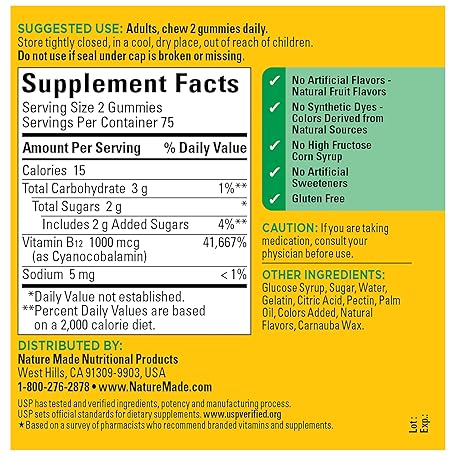 Thông tin sản phẩm Nature Made Energy B12 1000 mcg, Dietary Supplement for Energy Metabolism Support, 150 Gummies, 75 Day Supply