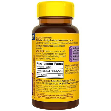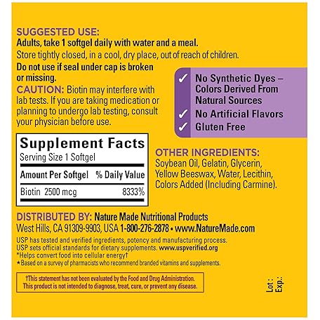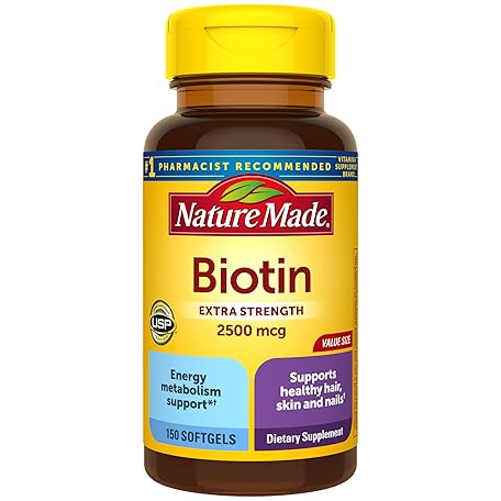 Thông tin sản phẩm Nature Made Extra Strength Biotin 2500 mcg, Dietary Supplement For Healthy Hair, Skin & Nail Support, 150 Softgels, 150 Day Supply