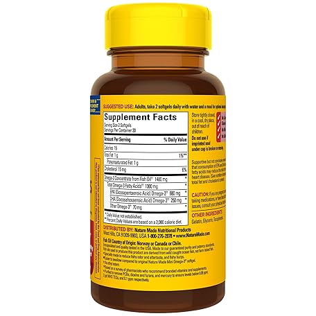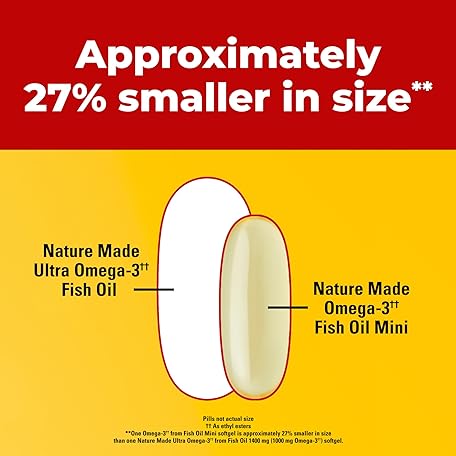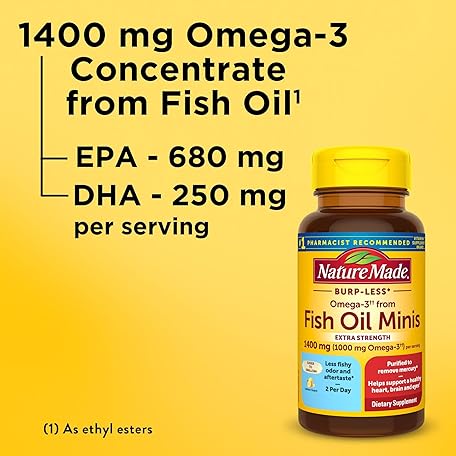 Sản phẩm Nature Made Extra Strength Burp Less Fish Oil Omega 3 Supplements 1400 mg Minis, Omega 3 Fish Oil as Ethyl Esters for Healthy Heart Brain Eyes Support, 60 Softgels, 30 Day Supply đang được bán với giá ưu đãi là $11.8919 tại nước Mỹ.