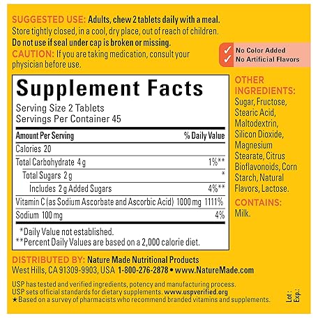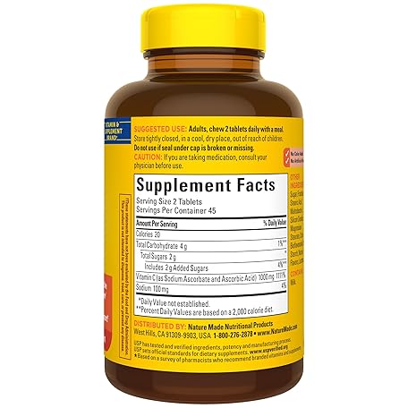 Thông tin sản phẩm Nature Made Extra Strength Dosage Chewable Vitamin C 1000 mg per serving, Dietary Supplement for Immune Support, 90 Tablets, 45 Day Supply