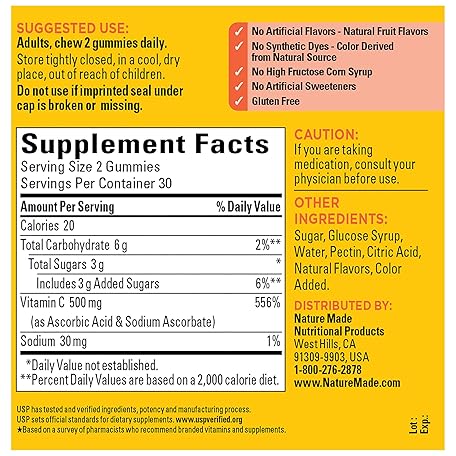 Thông tin sản phẩm Nature Made Extra Strength Dosage Vitamin C 500 mg per serving, Dietary Supplement for Immune Support, 60 Gummies, 30 Day Supply