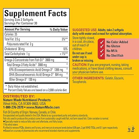 Thông tin sản phẩm Nature Made Extra Strength Omega 3 Fish Oil Supplements, 2800mg, Fish Oil Omega 3 Supplements as Ethyl Esters for Healthy Heart, Brain, Eyes, Mood Support, 60 Softgels, 30 Day Supply