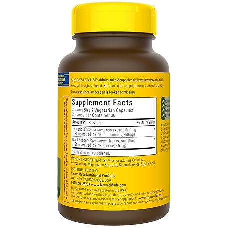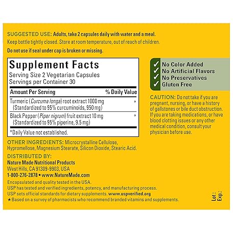 Thông tin sản phẩm Nature Made Extra Strength Turmeric Curcumin with Black Pepper, 1000mg Turmeric Extract per serving (Standardized to 95% Curcuminoids), Supports Healthy Inflammation Response, 60 Vegetarian Capsules