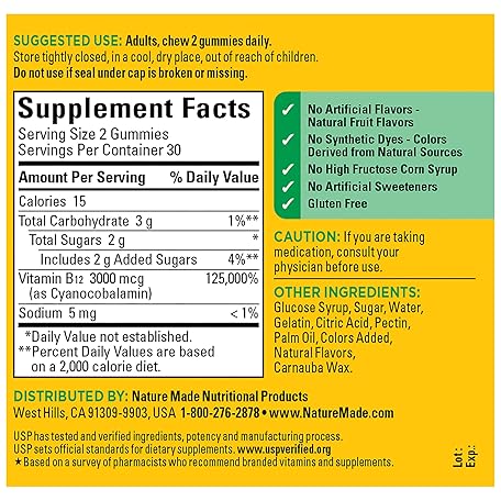 Thông tin sản phẩm Nature Made Extra Strength Vitamin B12 Gummies, 3000 mcg per serving, B12 Vitamin Supplement for Energy Metabolism Support, 60 Gummy Vitamins, 30 Day Supply