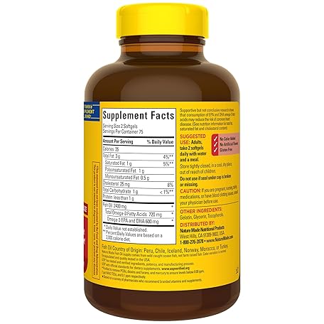 Thông tin sản phẩm Nature Made Fish Oil Omega 3 Supplements, 1200 mg Softgels, Omega 3 Fish Oil for Healthy Heart Support, 150 Softgels, 75 Day Supply