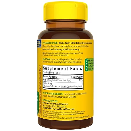 Thông tin sản phẩm Nature Made Folic Acid 400 mcg (665 mcg DFE), Dietary Supplement for Nervous System Function, 250 Tablets, 250 Day Supply