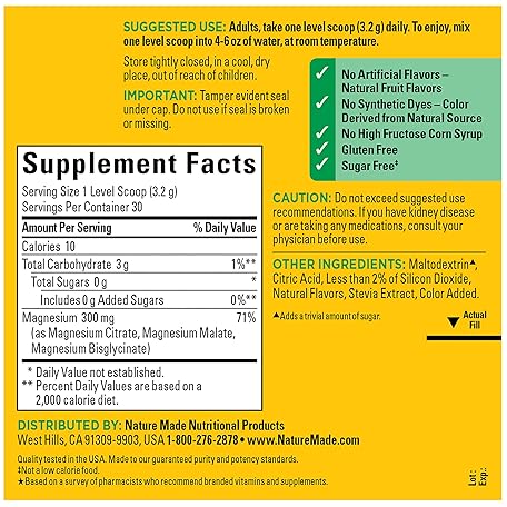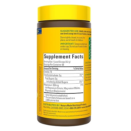 Nature Made High Absorption Magnesium Complex Drink Mix Powder, Magnesium Citrate, Magnesium Glycinate & Magnesium Malate 3-in-1 Blend, Pink Lemonade Flavor, 96 g, 30 Day Supply