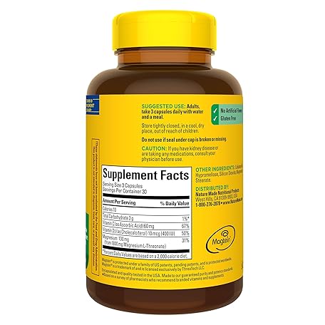 Thông tin sản phẩm Nature Made Magnesium L-Threonate with Vitamin C & Vitamin D3, Provides 130 mg of Mag from 1800 mg Magnesium L Threonate, Cognitive Support Magnesium Supplement, 90 Capsules, 30 Day Supply