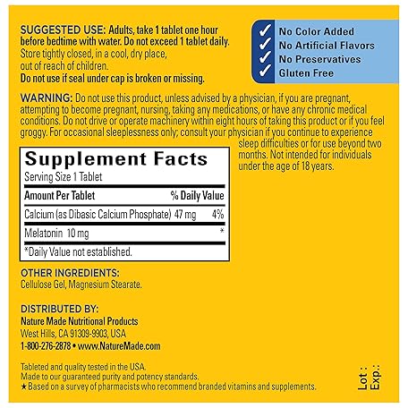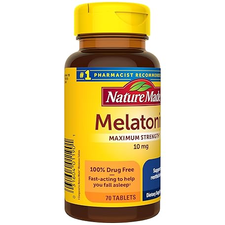 Thông tin sản phẩm Nature Made Melatonin 10mg Maximum Strength Tablets, 100% Drug Free Sleep Aid for Adults, Melatonin for Adults, 70 Count, 70 Day Supply