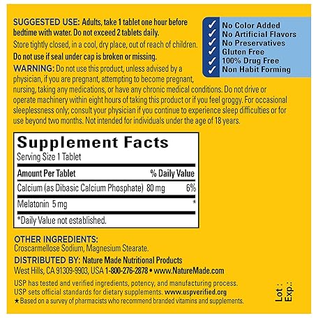 Thông tin sản phẩm Nature Made Melatonin 5mg Tablets Extra Strength, 100% Drug Free Sleep Aid for Adults, 90 Tablets, 90 Day Supply