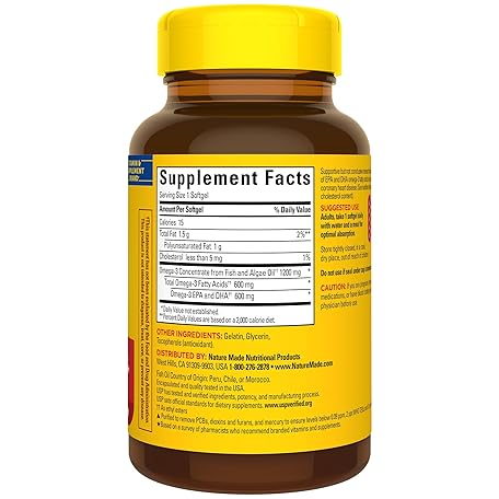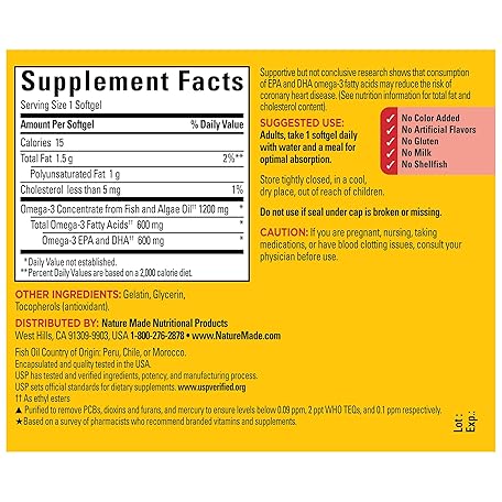 Thông tin sản phẩm Nature Made Omega 3 Fish Oil and Algae Oil Supplements, 1200mg, Omega 3 Supplement for Heart, Brain and Eyes Support, One Per Day, 60 Softgels