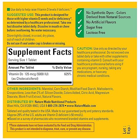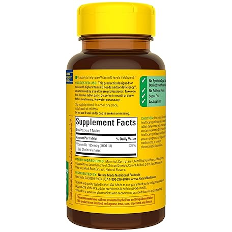 Thông tin sản phẩm Nature Made Vitamin D3 5000 IU (125 mcg) Extra Strength, Vitamin D Supplement for Immune Support, 70 Sugar Free Fast Dissolve Tablets, 70 Day Supply