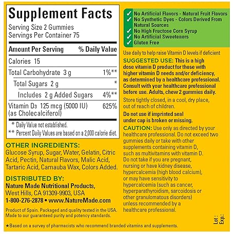 Thông tin sản phẩm Nature Made Vitamin D3 5000 IU Per Serving Gummies Extra Strength, Bone and Immune Health Support, 150 Vitamin D Gummies for Adults, 75 Day Supply