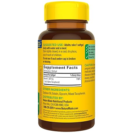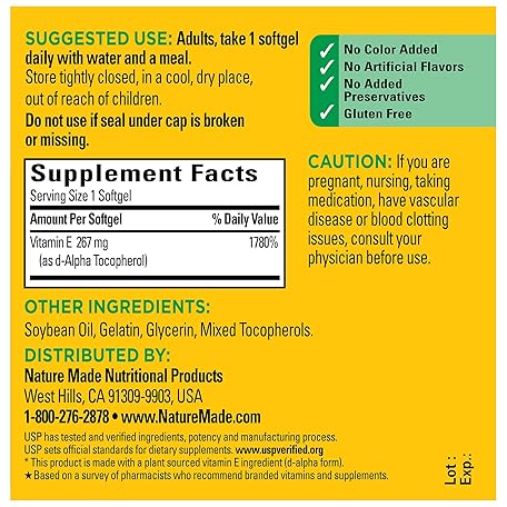 Thông tin sản phẩm Nature Made Vitamin E 267 mg (400 IU) d-Alpha, Dietary Supplement for Antioxidant Support, 100 Softgels, 100 Day Supply