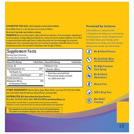 Thương hiệu Nature Made là cái tên nổi tiếng được rất nhiều khách hàng trên thế giới chọn lựa. Với kiểu dáng đẹp mắt, sang trọng, sản phẩm Nature Made Wellblends Sleep and Recover, Sleep Aid with Melatonin 3mg to Support Restful Sleep, plus L theanine 200mg and Magnesium Citrate, 44 Gummies là sự lựa chọn hoàn hảo nếu bạn đang tìm mua một món cho riêng mình.