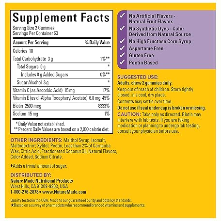 Thông tin sản phẩm Nature Made Zero Sugar Hair Skin Nails Gummies, Biotin 2500 mcg per Serving, 120 Sugar Free Gummies, 60 Day Supply