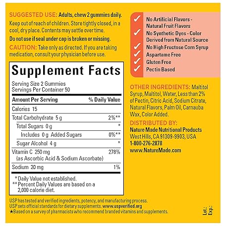 Thông tin sản phẩm Nature Made Zero Sugar Vitamin C Gummies 250 mg per Serving, Immune & Antioxidant Support, Aspartame Free, 100 Sugar Free Gummies, 50 Day Supply