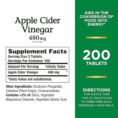 Thông tin sản phẩm Nature's Bounty Apple Cider Vinegar 480mg Pills, Vegetarian Supplement Plant Based, 200 Tablets