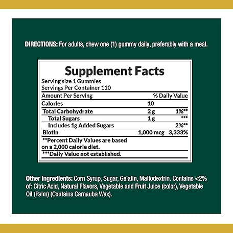 Thông tin sản phẩm Nature's Bounty Biotin Gummy, Vitamin Supplement, Supports Healthy Hair, Skin, and Nails, Fruit Flavored Gummies, 1000 mcg, 110 Count