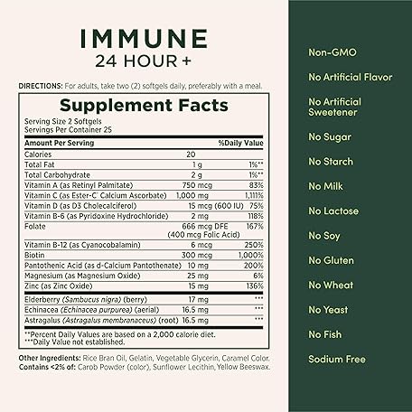 Thông tin sản phẩm Nature's Bounty Immune 24 Hour +, The only Vitamin C with 24 Hour Immune Support from Ester-C, 1000 mg Vitamin C, D & Zinc, Gluten Free, Rapid Release Softgels, 2 Softgels per Day, 50 Count