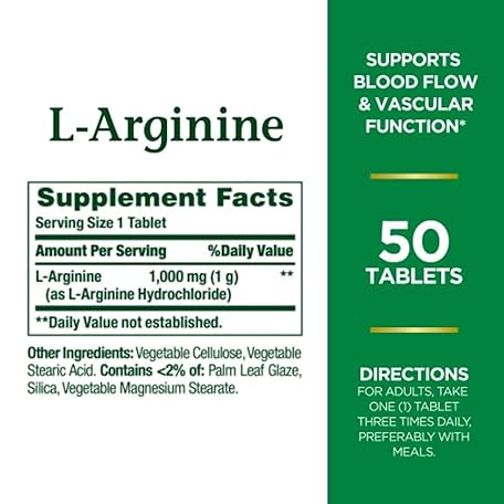 Thông tin sản phẩm Nature’s Bounty L-Arginine 1000mg for Supporting Blood Flow and Vascular Function – Non-GMO, Gluten Free, 50 Tablets