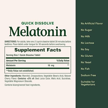 Thông tin sản phẩm Nature's Bounty Melatonin, 100% Drug Free Sleep Aid, Dietary Supplement, Promotes Relaxation and Sleep Health, 10mg, 45 Quick Dissolve Tablets