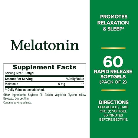 Thông tin sản phẩm Nature's Bounty Melatonin 5mg, 100% Drug Free Sleep Aid, Dietary Supplement for Relaxation and Sleep Health - 4 Month Supply, 60 Rapid Release Softgels Twin Pack (120ct)