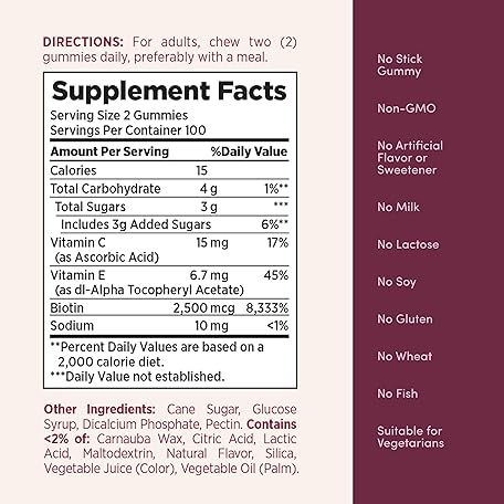 Thông tin sản phẩm Nature's Bounty Optimal Solutions Hair, Skin and Nails Pectin Gummies, 2500 mcg Biotin Per Serving, No Stick Gummy, Vegetarian Formula, Strawberry Flavor, 200 count, 100 Total Servings