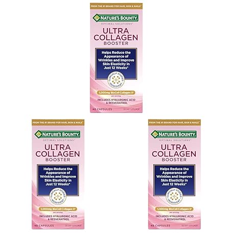 Nature's Bounty Optimal Solutions Ultra Collagen Booster for Healthy-Aging Supplement, Resveratrol, Hyaluronic Acid – Collagen Capsules for Women, 48 Capsules (Pack of 3)