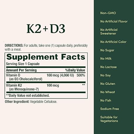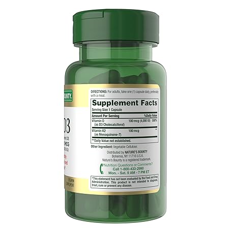 Thông tin sản phẩm Nature's Bounty Vitamin D3 K2 Supplement, 4000 IU Vitamin D3 Plus 100 mcg of Vitamin K Supplements for Adults for Heart & Bone Health Support, 60 Day Supply, 60 Vegetarian Capsules (Pack of 3)